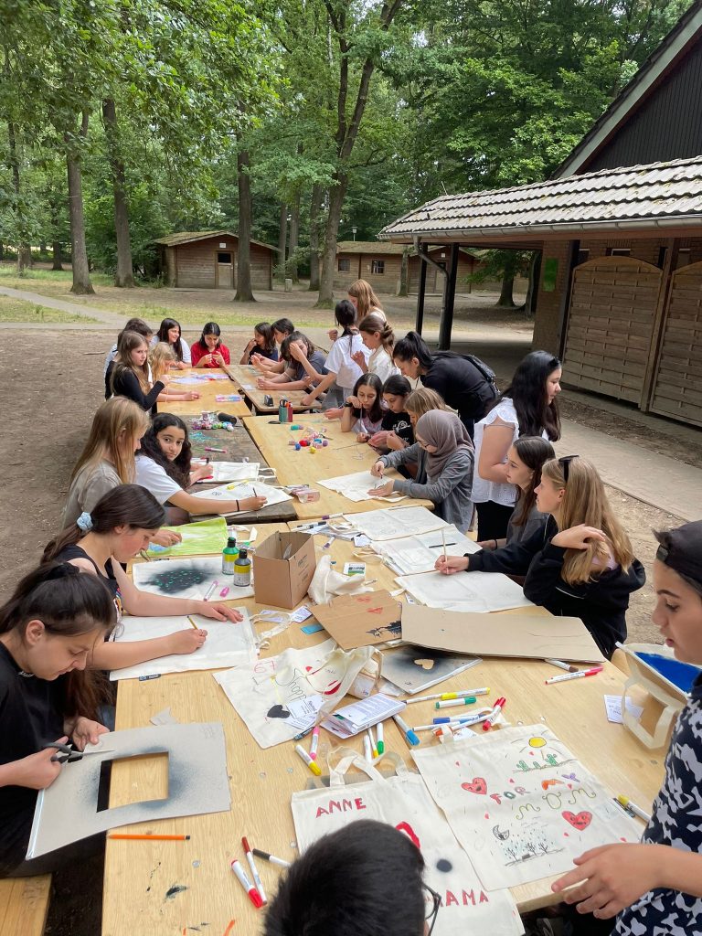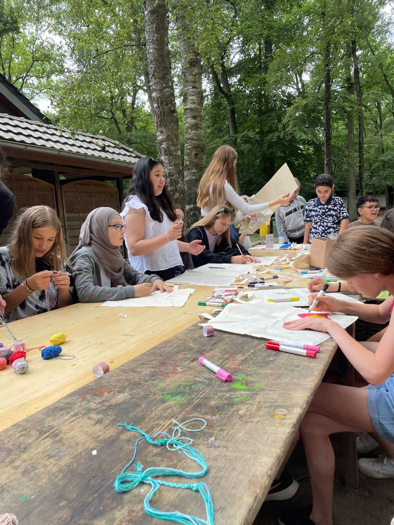 Am Nachmittag boten die Lehrer dann verschiedene Workshops an. Mit großem Elan wurde geklettert, Badminton, den Schülerinnen und Schülern besser bekannt als Federball, und Tischtennis gespielt. Aber auch die kreativen Angebote wurden begeistert angenommen: Taschen und Steine bemalen, (Perlen)Schmuck basteln und Freundschaftsbänder knüpfen. Bei herrlichem Wetter verging die Zeit wie im Flug.