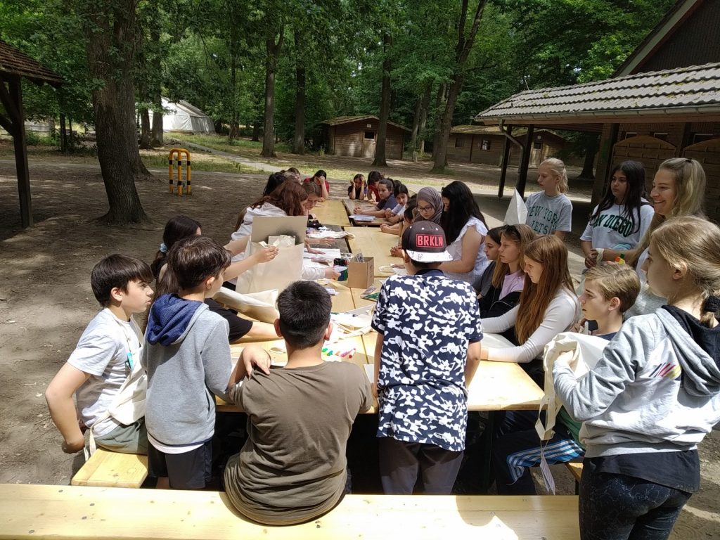 Zwischendurch wurde gepicknickt. Das Mittagessen hatten nämlich alle noch von Zuhause mitgebracht. Besonders einfallsreich erwiesen sich hierbei die Mädchen aus der 6c, die ein Farbenpicknick organisiert hatten. Jedes Mädchen hatte im Vorfeld eine Farbe bekommen und sollte nun Essen in dieser Farbe mitbringen, etwa rote Tomaten, orangene Möhren, aber auch rosa Marshmallows oder braune Schokolade.