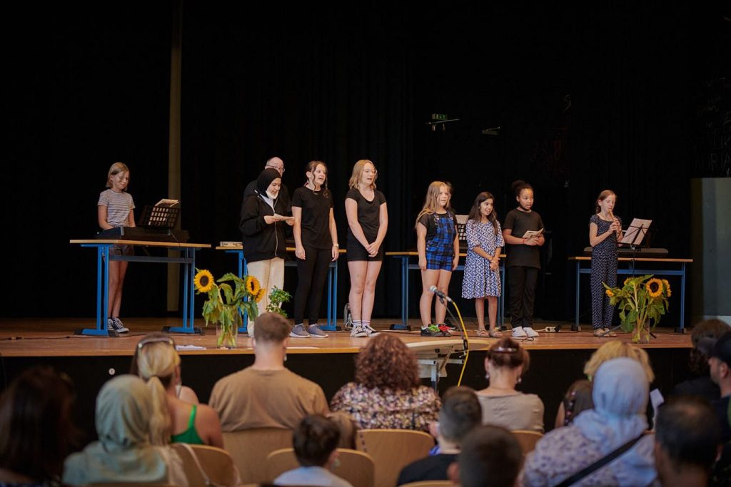 Innerhalb des musikalisch-künstlerischen Rahmens traten drei „Showacts“ in der Aula auf: Aktuelle Sechstklässler aus den Klassen 6a und 6e sangen und spielten mit dem Musiklehrer Jost Enninger zweimal für die Gäste. Auch einige Siebtklässler aus der 7a performten selbstgeschriebene „Poetry Slam Stücke“ mit auswendig eingeübten Zeilen zum Thema „eure neue Schule“. All diese Schülerinnen und Schüler hatten sich extra vorher noch in den Ferien zur Probe hierfür getroffen, um den Gästen eine gute Show zu bieten. Dafür wurden sie nach ihrem Auftritt mit viel Applaus belohnt.