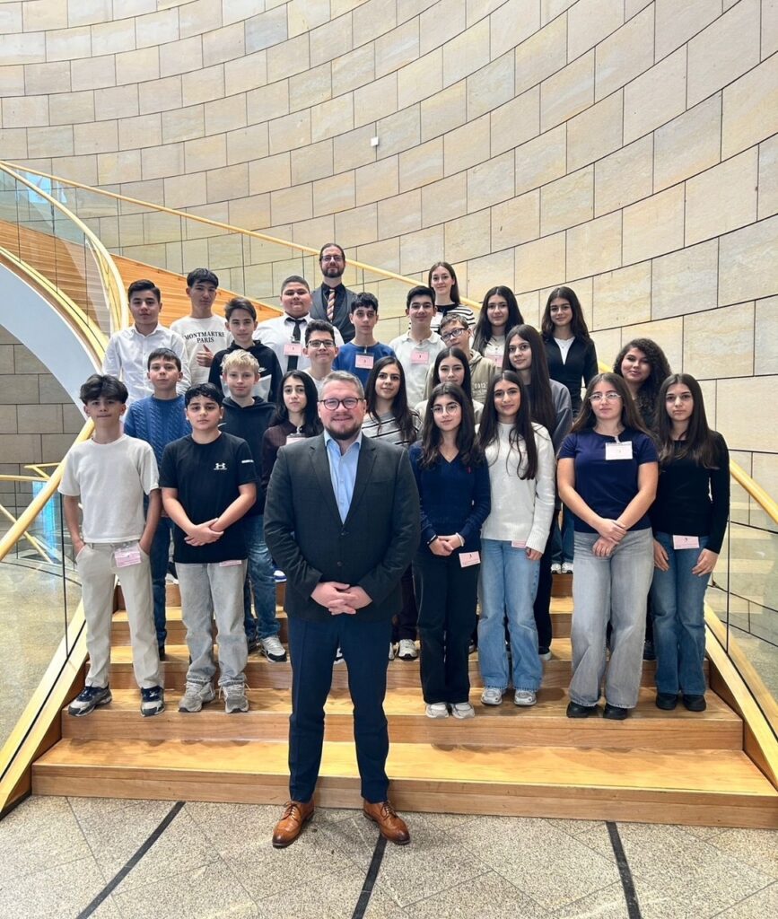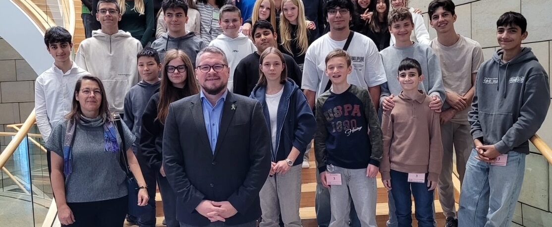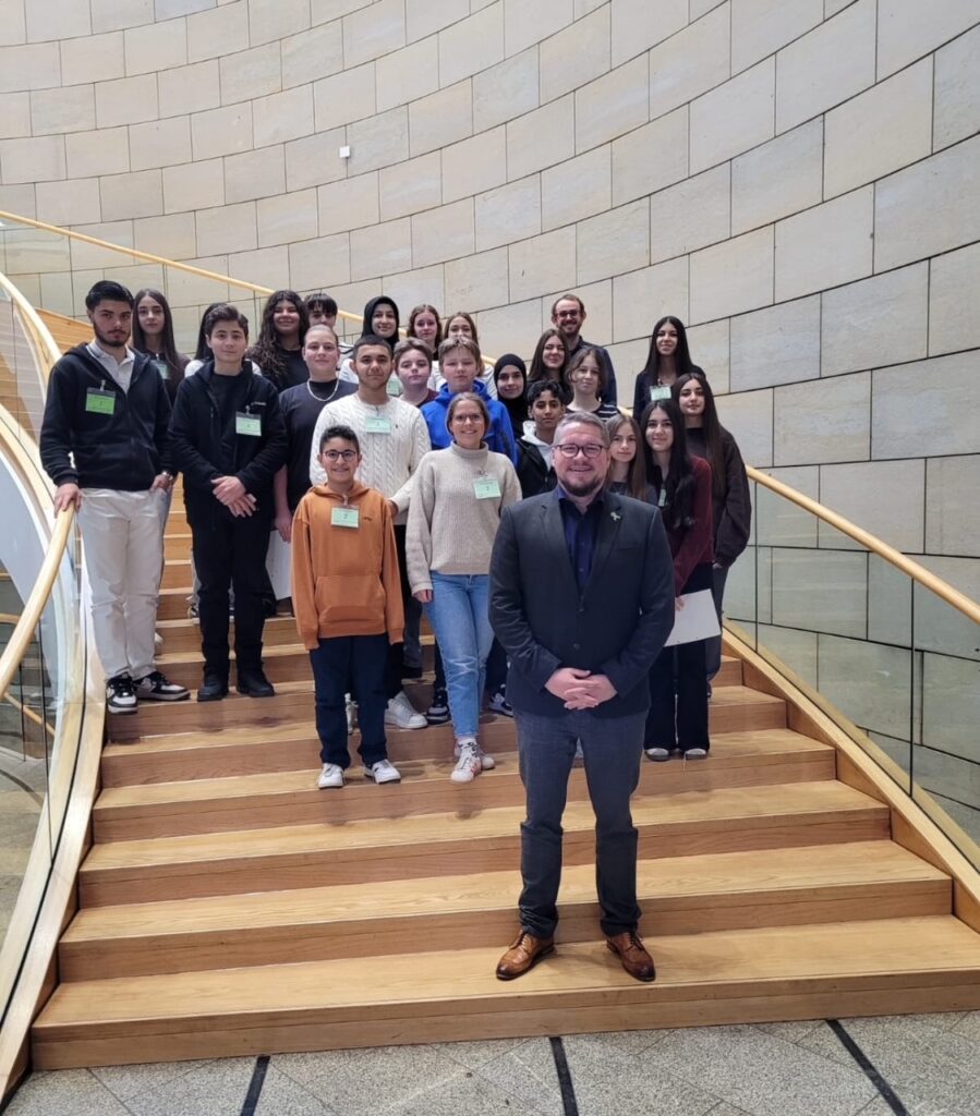Nach einer Tour durch den Landtag und dem Beiwohnen einer Plenardebatte auf der Besuchertribüne wurden die Schülerinnen und Schüler von Benedikt Falszewski empfangen.