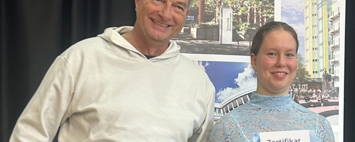 Diesen Montag hat unsere Schülerin Elina im Rahmen einer Feierstunde in der Aula der Universität Duisburg ein Zertifikat überreicht bekommen. Mit dieser Urkunde würdigt die Fakultät für Informatik ihre Teilnahme am Angebot des Frühstudiums: Elina hat im Sommersemester 2025 im Studiengang: „menschenzentrierte Informatik und Psychologie“ erfolgreich die Vorlesung „Allgemeine Psychologie – Emotion und Motivation“ besucht.