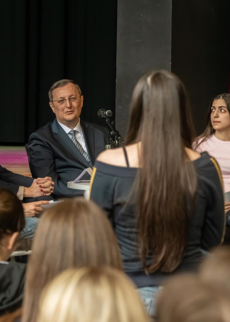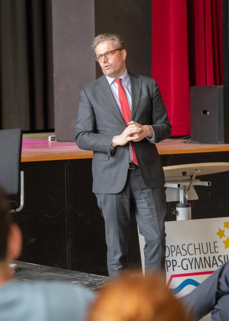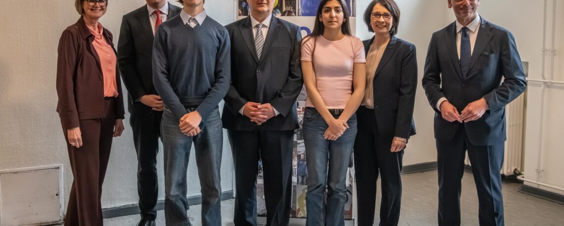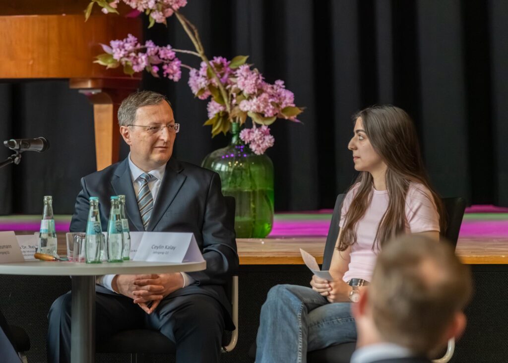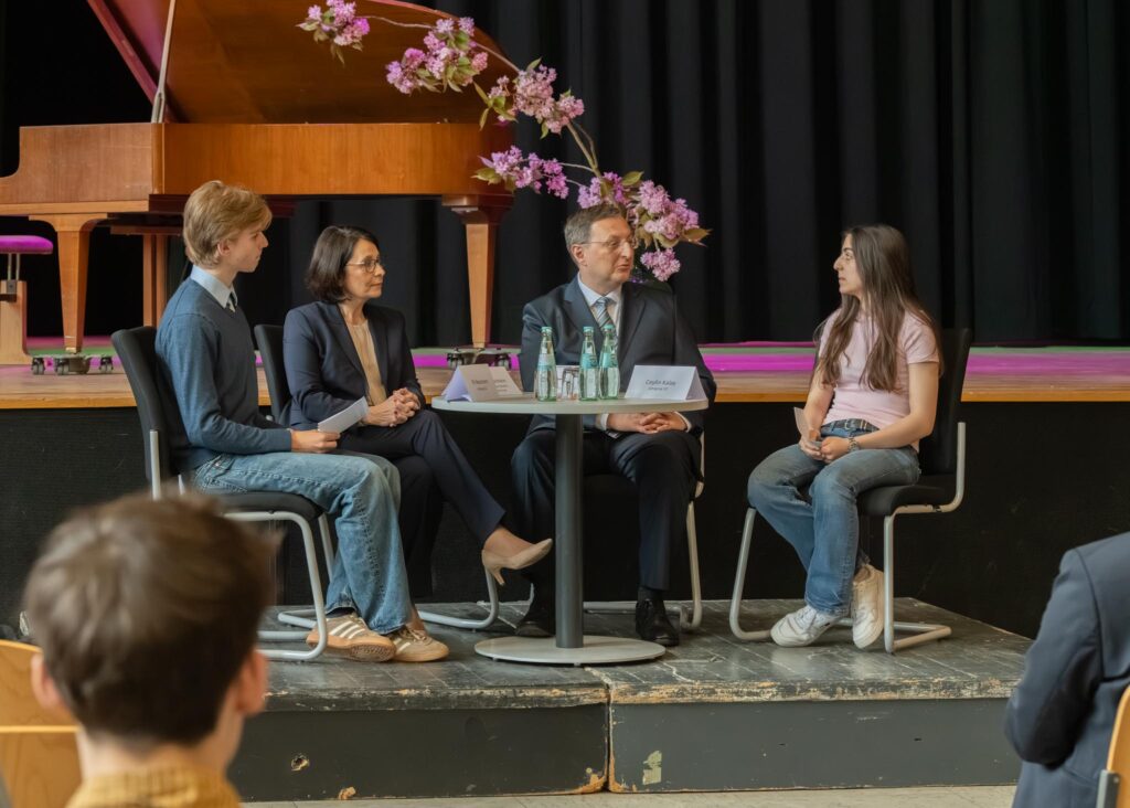 Am 17. April besuchte uns der türkische Botschafter, Herr Turan, um sich im Rahmen unserer Gesprächsreihe Das Krupp im Dialog mit … Schülerinnen und Schülern zu unterhalten. Pit Neumann und Ceylin Kalay führten durch die Podiumsdiskussion und stellten an den Botschafter kluge Fragen zu seinem Werdegang, immerhin war er einst Schüler unserer Schule und ist nun der Botschafter der Türkei in Deutschland! Auch interessierte Pit und Ceylin seine Sicht auf die Beziehungen der EU und der Türkei. Die besondere Bedeutung der Beziehungen zwischen Deutschland und der Türkei stellte der Botschafter deutlich in den Fokus seiner Darlegungen. Herr Turan wurde von Herrn Wiermer, Staatssekretär für Europaangelegenheiten sowie Internationales, begleitet wie auch von Frau Dr. Reinlein, die das Schulministerium vertrat und an der Diskussion mit klaren Worten teilnahm.