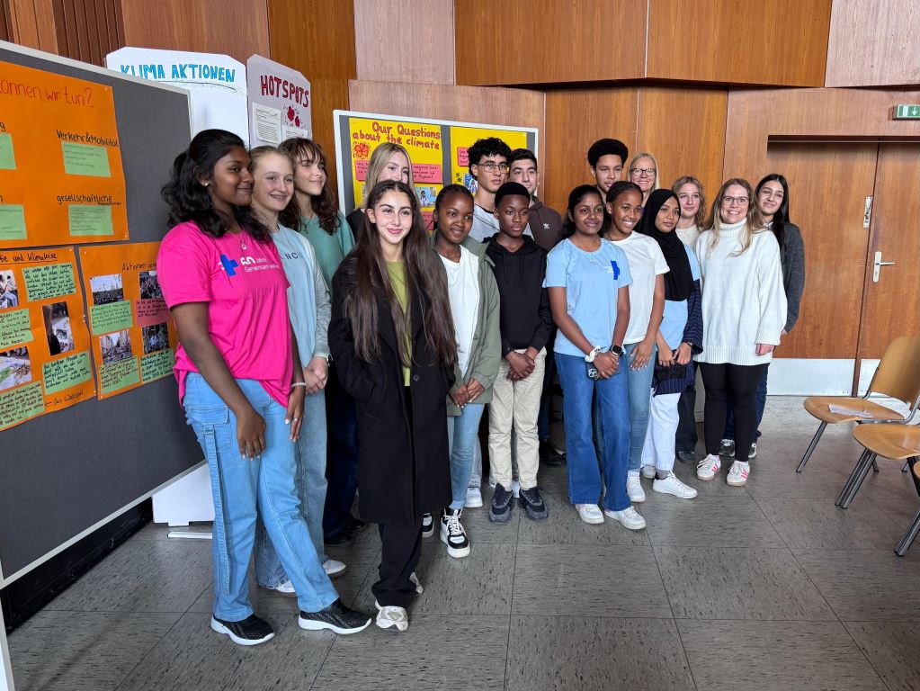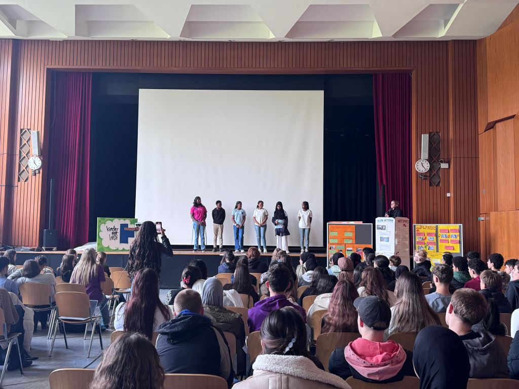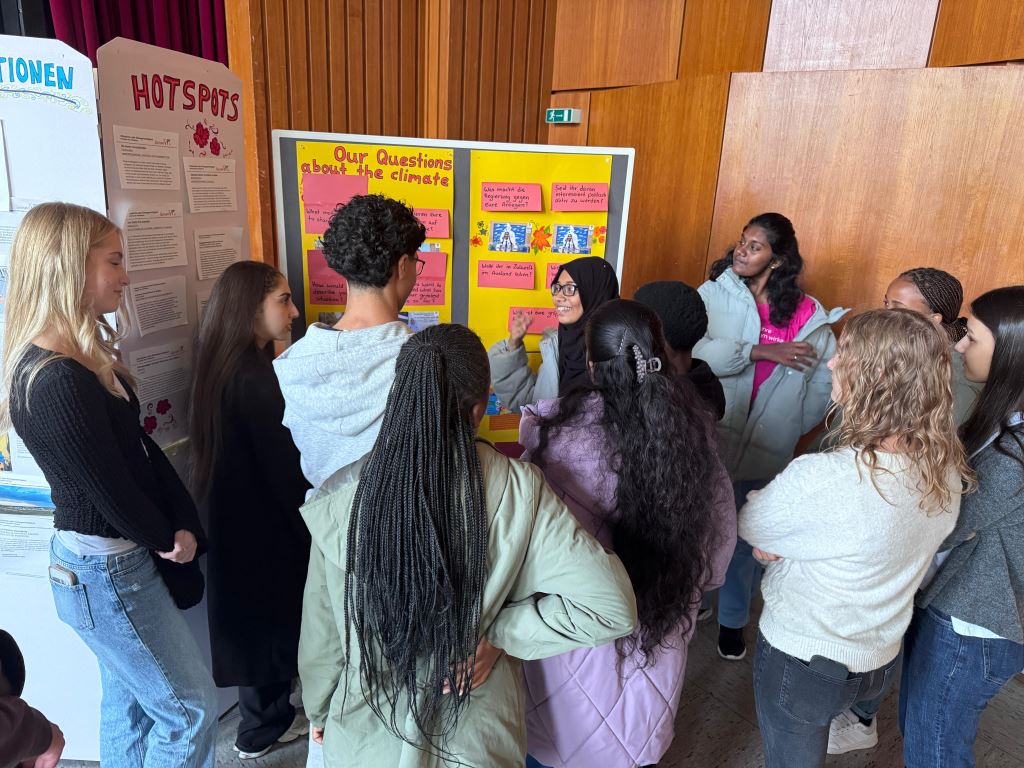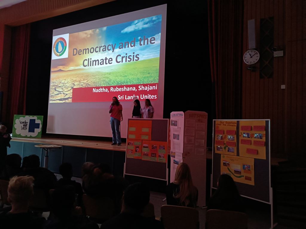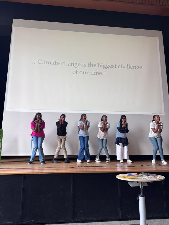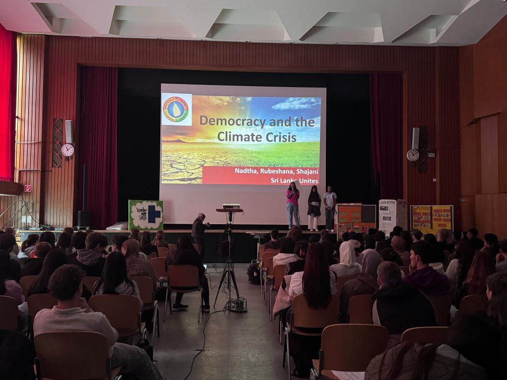 Am Freitag, 26.9.25, informierten Lizwi, Sthandiwe und Syamthemba aus Südafrika und Shajani, Rubeshana und Zuhra aus Sri Lanka die Schülerinnen und Schülern der zehnten und elften Jahrgangsstufen in der Aula über ihre Aktionen zum Thema „Demokratie und Klimakrise“.