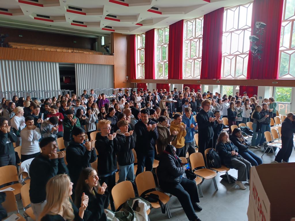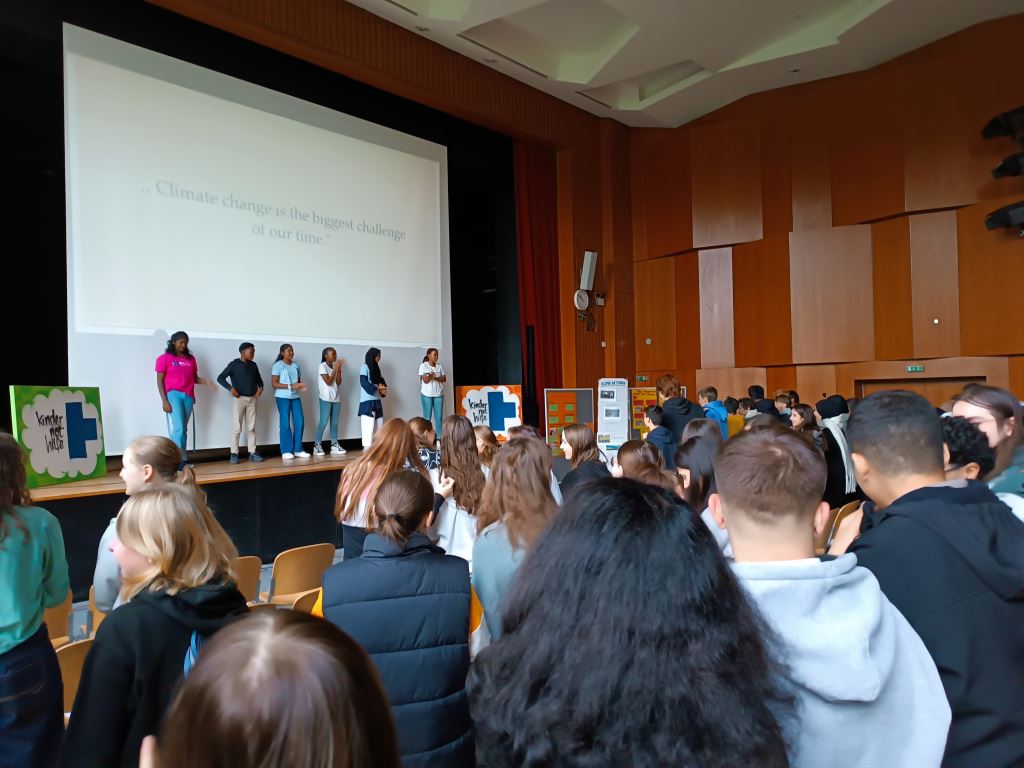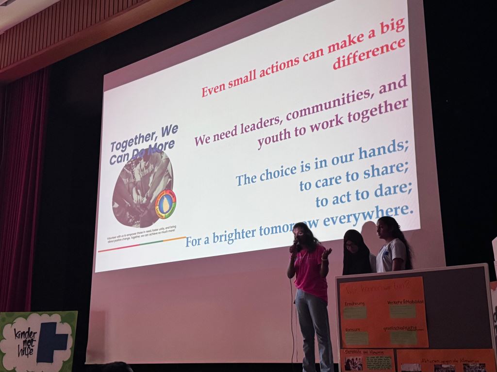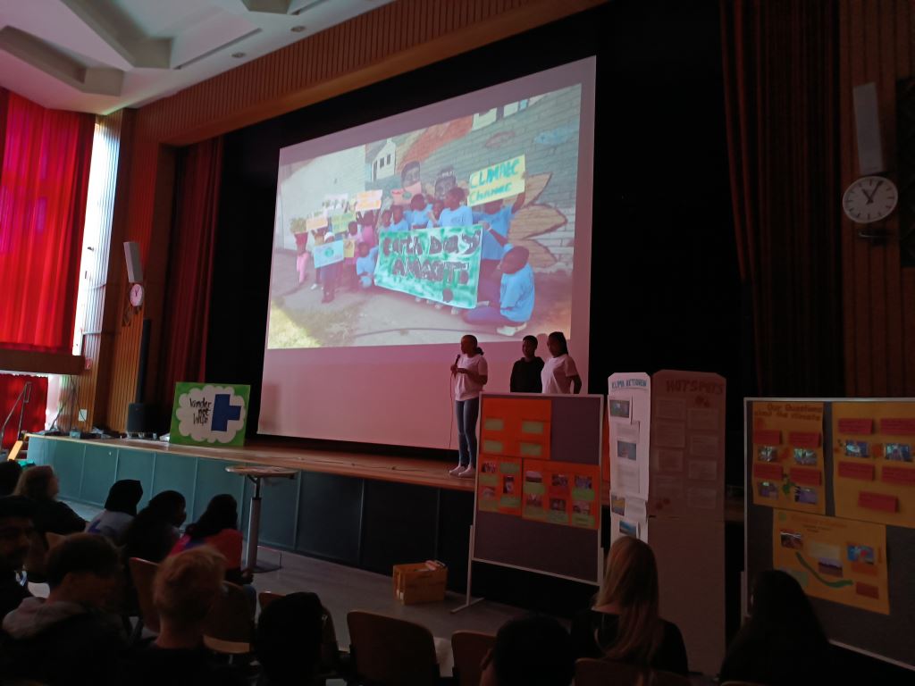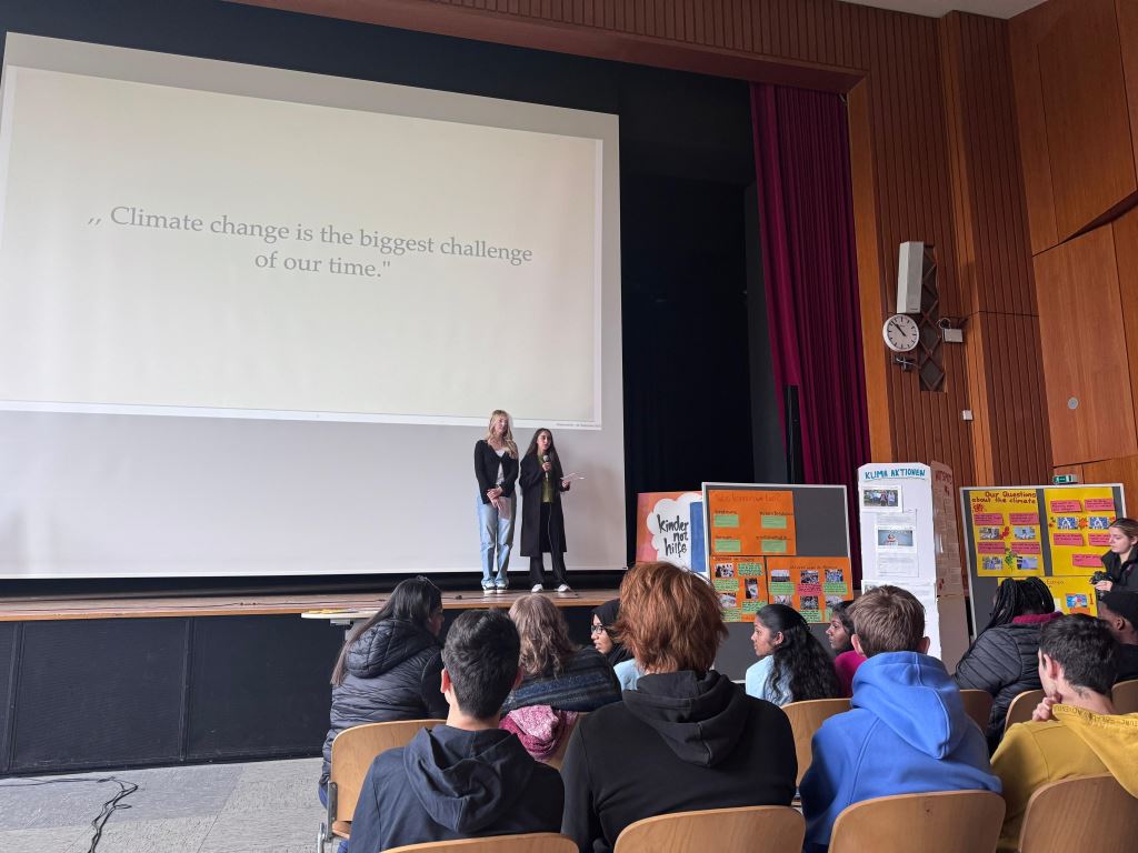 Am Freitag, 26.9.25, informierten Lizwi, Sthandiwe und Syamthemba aus Südafrika und Shajani, Rubeshana und Zuhra aus Sri Lanka die Schülerinnen und Schülern der zehnten und elften Jahrgangsstufen in der Aula über ihre Aktionen zum Thema „Demokratie und Klimakrise“.