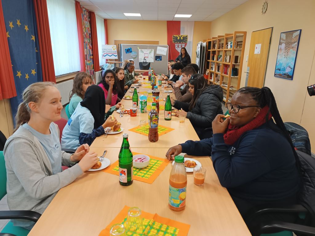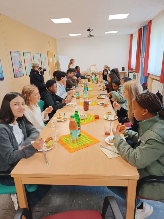 Nach der Präsentation in der Aula hatten Leni, Rüya, Yasin, Mehmet, Ela, Aliyah und Svea von der Projektgruppe „Demokratie und Klimakrise“ und Finja und Emmanuel von der SV ein wunderbares Buffet vorbereitet. Beim gemeinsamen Mittagessen tauschten sich die Jugendlichen intensiv aus, und die gemeinsame Stunde verging wie im Flug. Schließlich wurden Kontaktdaten für soziale Medien ausgetauscht, so dass man auch über die weite Entfernung in Verbindung bleiben kann.