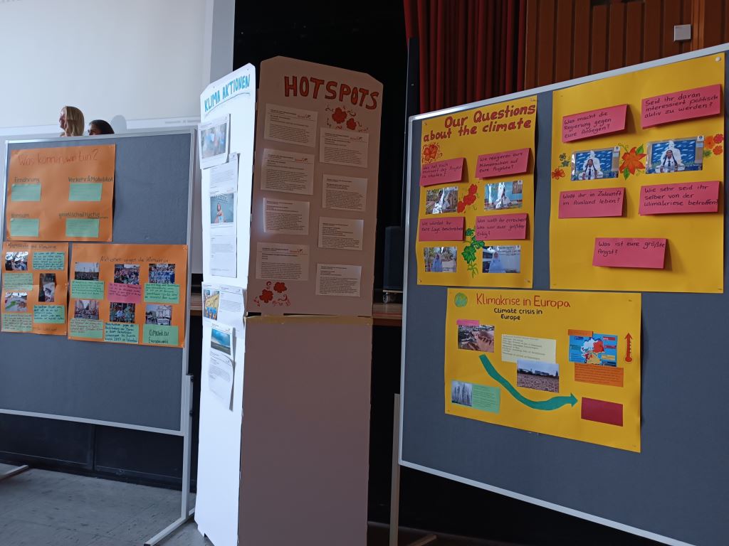 Zu Beginn sorgten die südafrikanischen Gäste mit einem lustigen Warmup für gute Stimmung. Ela und Aliyah aus der EF präsentierten in fließendem Englisch als Icebreaker Thesen zum Thema Klimakrise, die das Publikum durch Aufstehen oder Sitzenbleiben bewerten konnte.