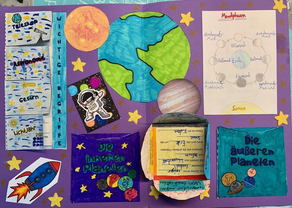 Zunächst waren sowohl die Schüler*innen als auch ich eher neugierig als unserer Sache sicher. Die Freude an der Arbeit und den Wissenshunger der Schüler*innen war in jeder Stunde wieder aufs Neue sehen. Die Beschäftigung mit einem Aspekt führt schnell zu weiteren Fragen und dies wieder weiter. Neben den vorgegebenen Inhalten und Kopiervorlagen waren die Schüler*innen auch angehalten ein eigenes selbstgewähltes Thema mit in ihr Lapbook zu bringen. So konnten sie mit Material der NASA zur ISS ebenso arbeiten, wie mit Sachbüchern zum Weltall und Sonnensystem oder mit den IPads.