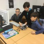 Wenn eine Aufgabe erledigt war, wurde ein neues, schwereres Problem in Angriff genommen. Die Programmierarbeit war recht anstrengend, machte aber auch viel Spaß. Immer wieder drehten die Roboter ihre Probeläufe über den Fußboden und über die Tische. Die dann bemerkten Fehler wurden am Computer korrigiert. Und schließlich waren die Schülerinnen und Schüler der 5a mächtig stolz, wenn sie ihren Roboter voll im Griff hatten. Nach drei Stunden fuhren alle Roboter ihre Kurven, stoppten wie gewünscht und absolvierten einen regelrechten Hindernis-Parcours.