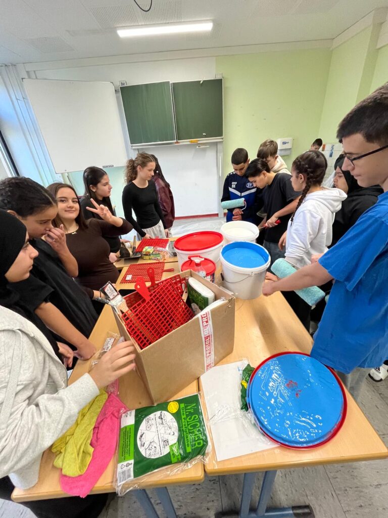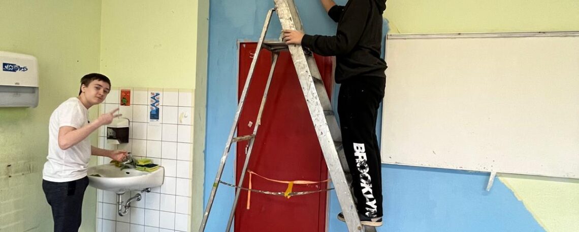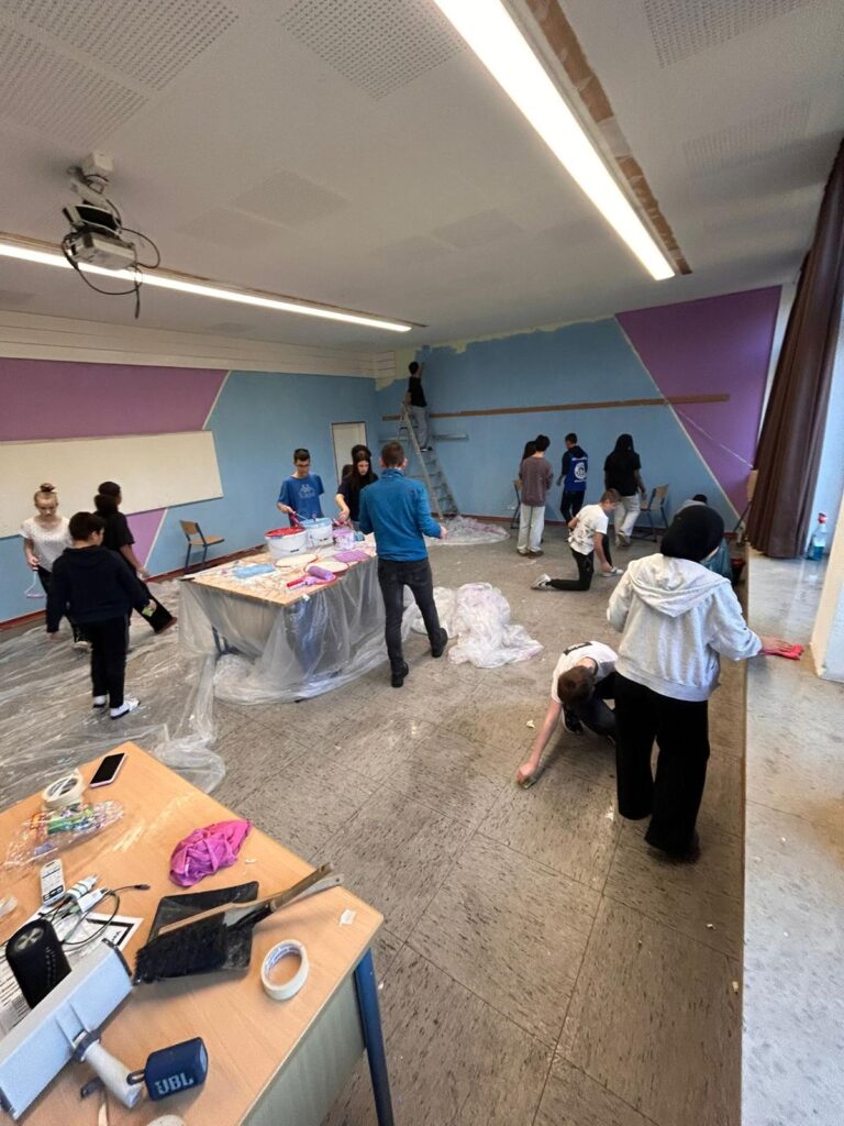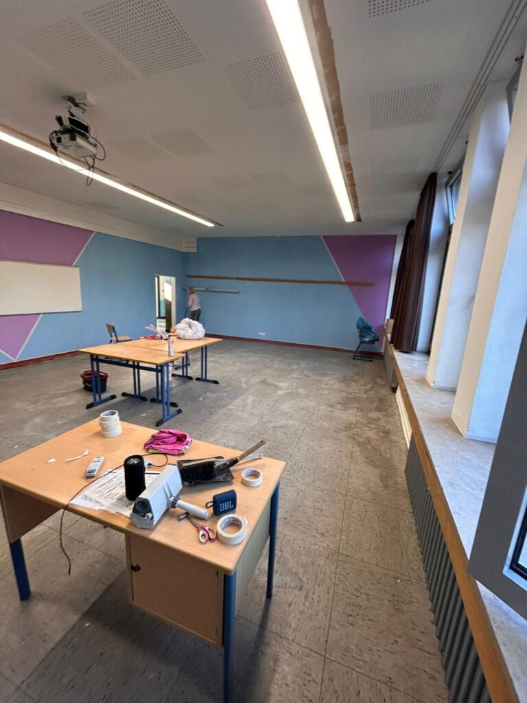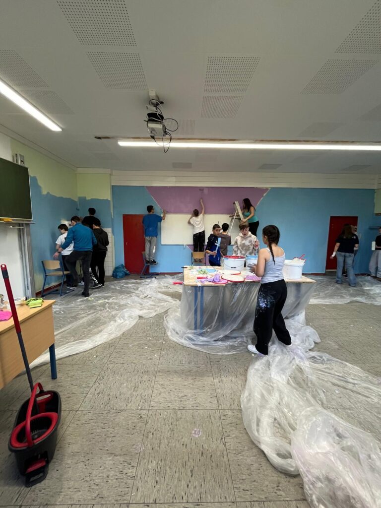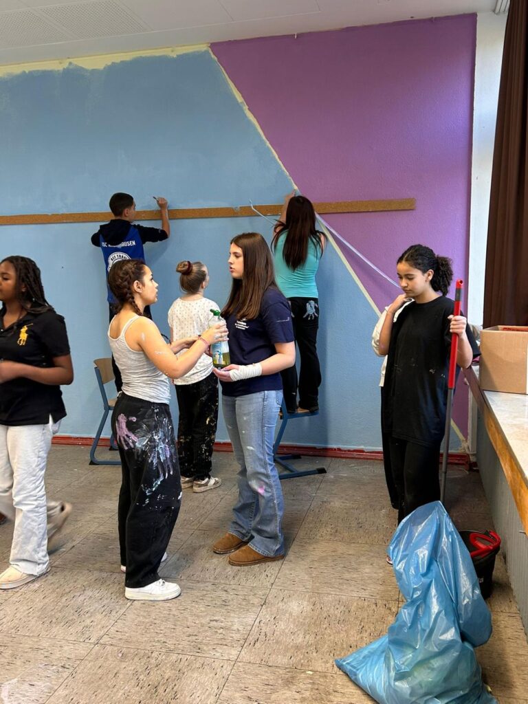 Gemeinsam wurden zuvor Farben und Gestaltungsideen ausgewählt, um den Raum heller, freundlicher und wohnlicher zu gestalten. Am Wandertag teilte sich die Klasse in zwei Gruppen auf. Zusammen mit Denise Revermann blieb der größere Teil der Klasse in der Schule und machte sich mit Motivation an die Arbeit: Wände wurden gestrichen, gereinigt und neu gestaltet. Die neuen Farben Blau und Violett sorgen nun für eine freundliche Atmosphäre. Natürlich wurde nicht jedes Detail perfekt – aber dafür ist das Ergebnis umso authentischer: von Schüler:innen für Schüler:innen.