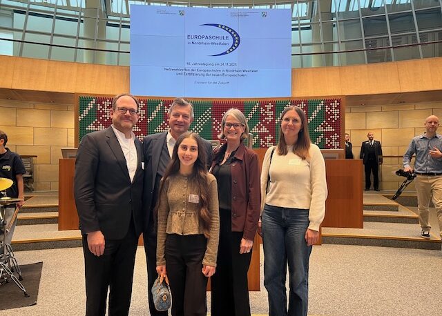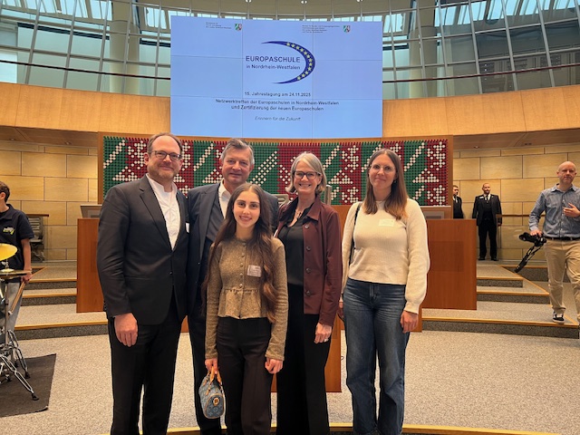 Die Jahrestagung der Europaschulen fand in diesem Jahr am 24.11.2025 im Landtag von NRW statt und trug das Motto „Erinnern für die Zukunft“. Auch das Krupp-Gymnasium war exklusiv eingeladen zum 15-jährige Jubiläum der Europaschulen, die bereits seit 2010 zertifiziert sind.