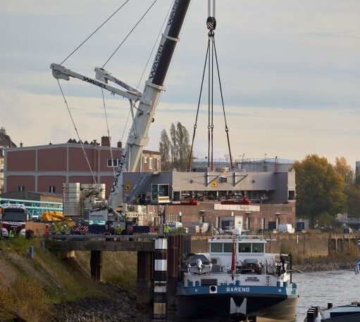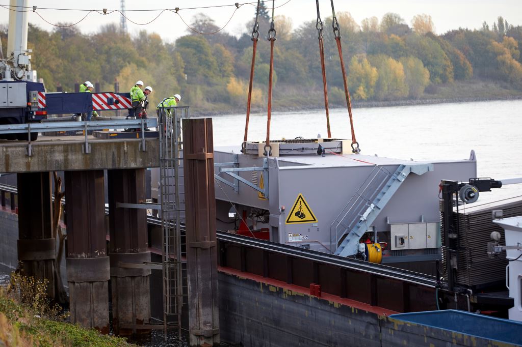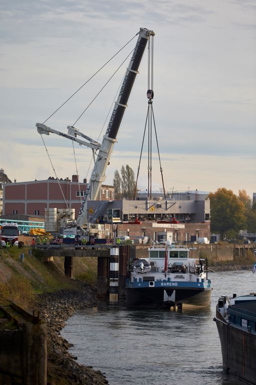 Am frühen Freitagmorgen sind wir in den Reisholzer Hafen gefahren, um die fertigen Kranteile auf ein Schiff zu verladen. Diese meterlangen Teile waren bereits in der Nacht zuvor mit Polizeibegleitung im Konvoi zum Hafen gebracht worden. Bei einem wunderschönen Sonnenaufgang wurden die Kranteile verladen und konnten zur Verschiffung vorbereitet werden.